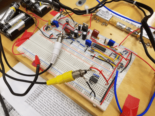 A fully functioning radar built out of two large coffee cans. The radar detects objects in front of it by their range and velocity, and displays monitored signals to a connected computer. Detected objects are indicated by dark blue or red spikes, depending on their proximity and speed of movement.