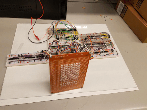 A pure hardware implementation of the popular 2D arcade game, Speed Racer, built with an LED matrix, protoboard, and analog and digital circuits. There are three score displays: player score, death score, and level. Players are scored by how long they survive. At higher levels, the speed of obstacles increases. The game ends when the player dies three times.